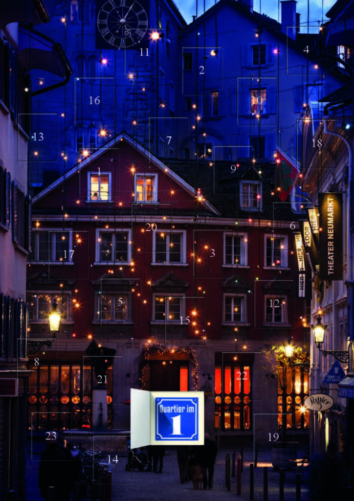 Der »Verein Quartier im 1« wurde 2016 gegründet zur Belebung der geschichtsträchtigen Seitengassen in der Altstadt rechts der Limmat, im Gebiet Neumarkt, Rindermarkt, Froschau-, Spiegel-, Prediger- und Brunngasse sowie Predigerplatz. Hier laden rund 120 Geschäfte, Bars, Restaurants und Handwerksbetriebe zum Verweilen ein.