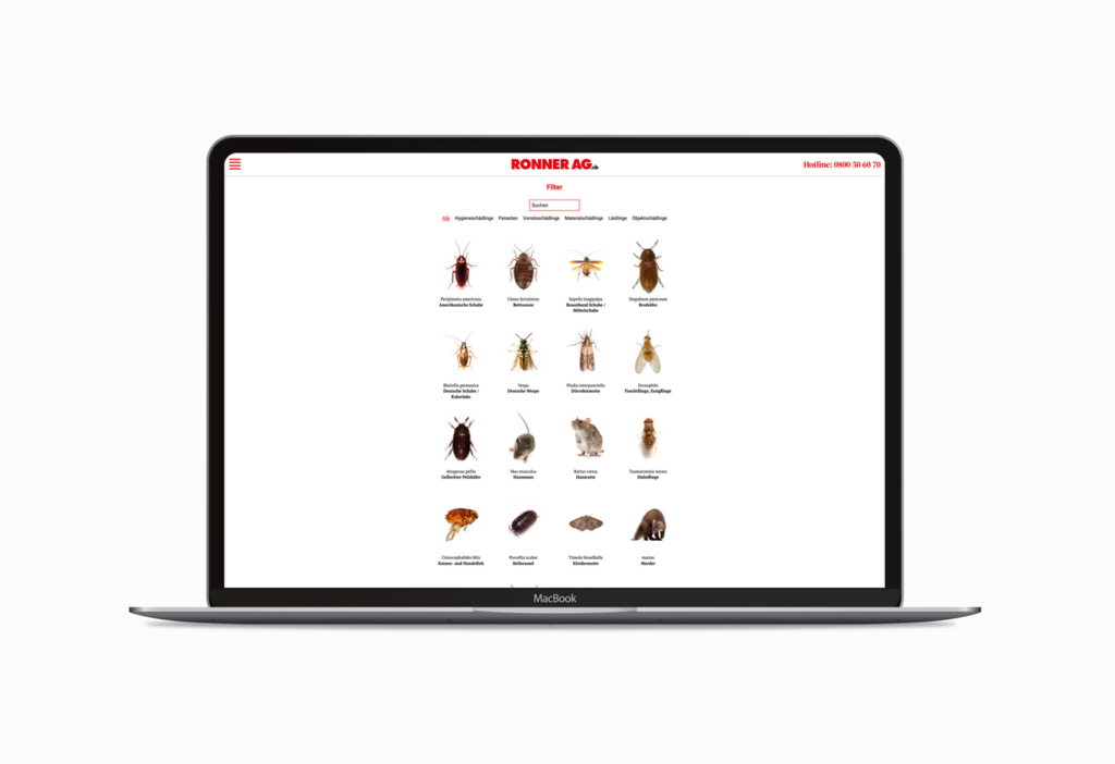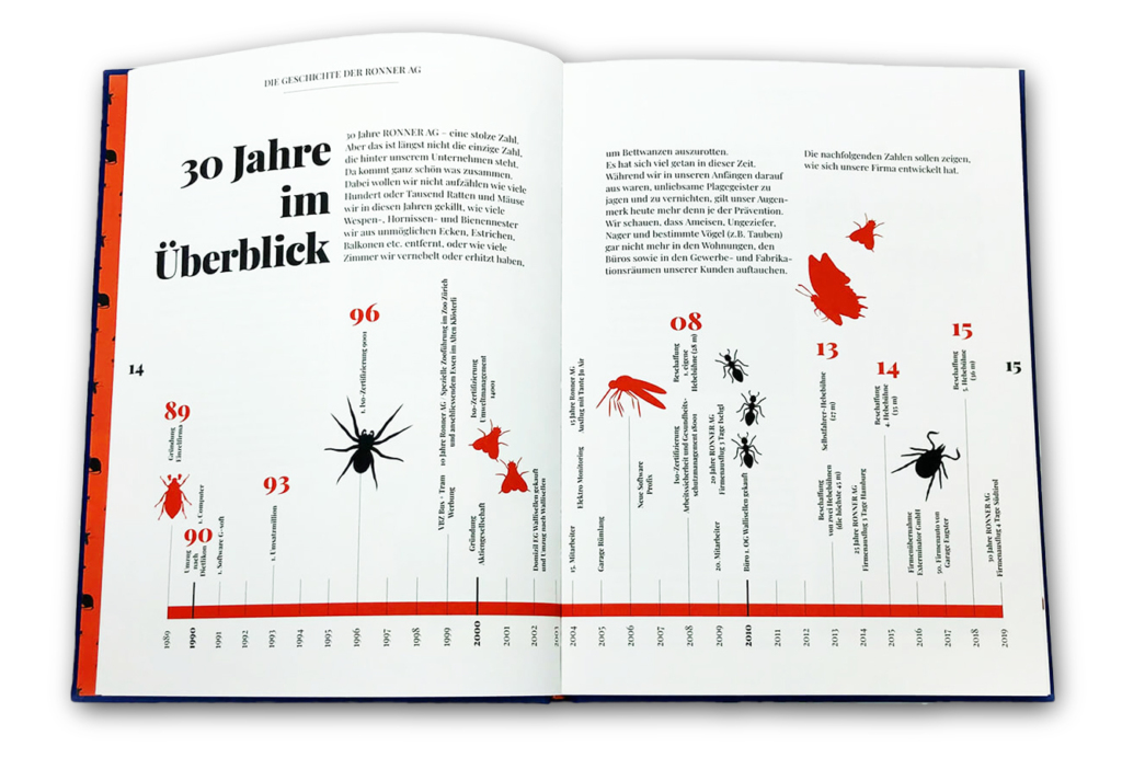 Für das 30igste Jubliläum des Insektenvernichters »Ronner« durften wir einerseits ein Buch gestalten, welches natürlich die Geschichte des Betriebes spannend erzählt. Aber auch die verschiedenen Insekten und Schädlinge bekommen ein Spotlight. Nicht nur im Buch aber auch auf der Neuen Website mit eingebautem Lexikon.